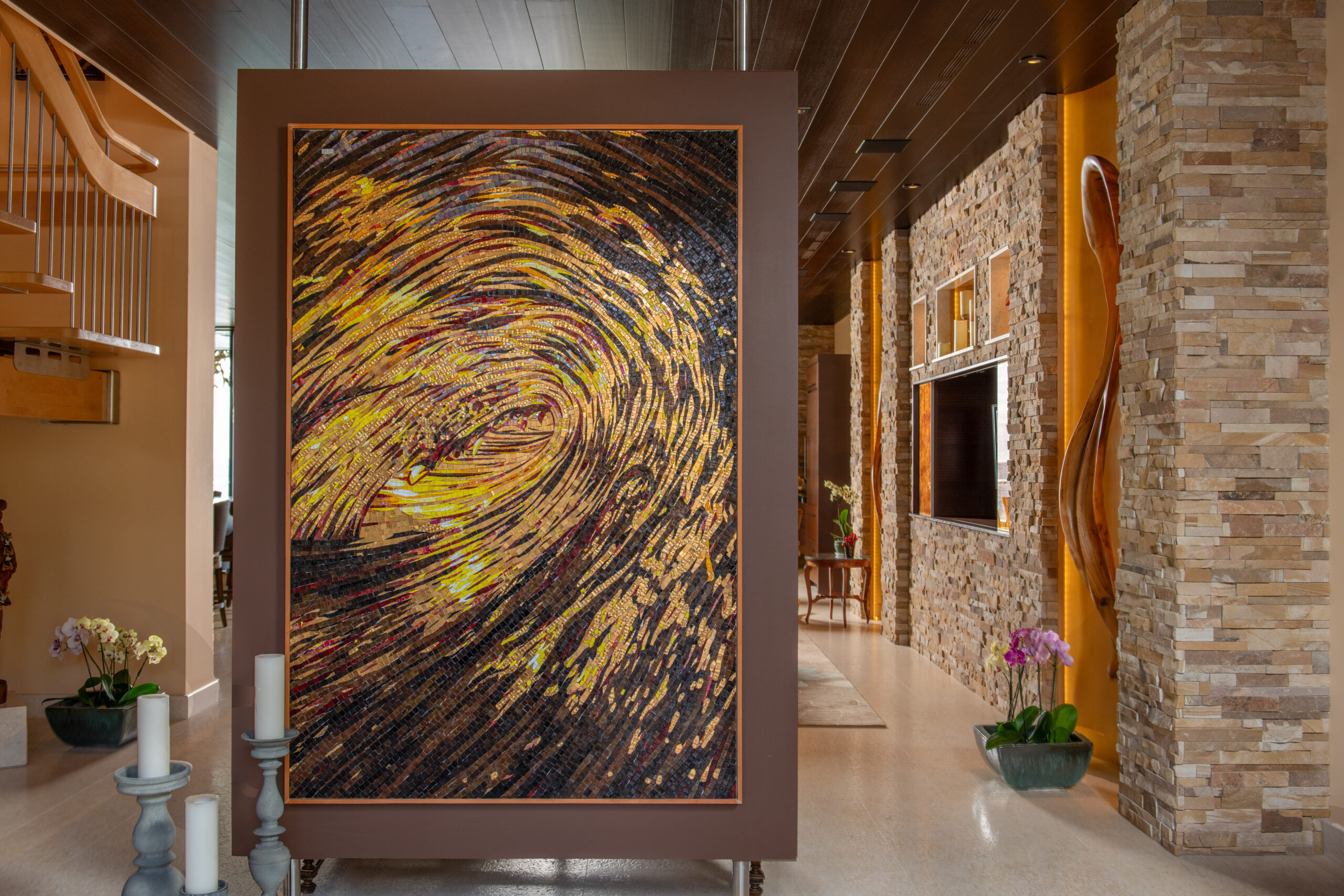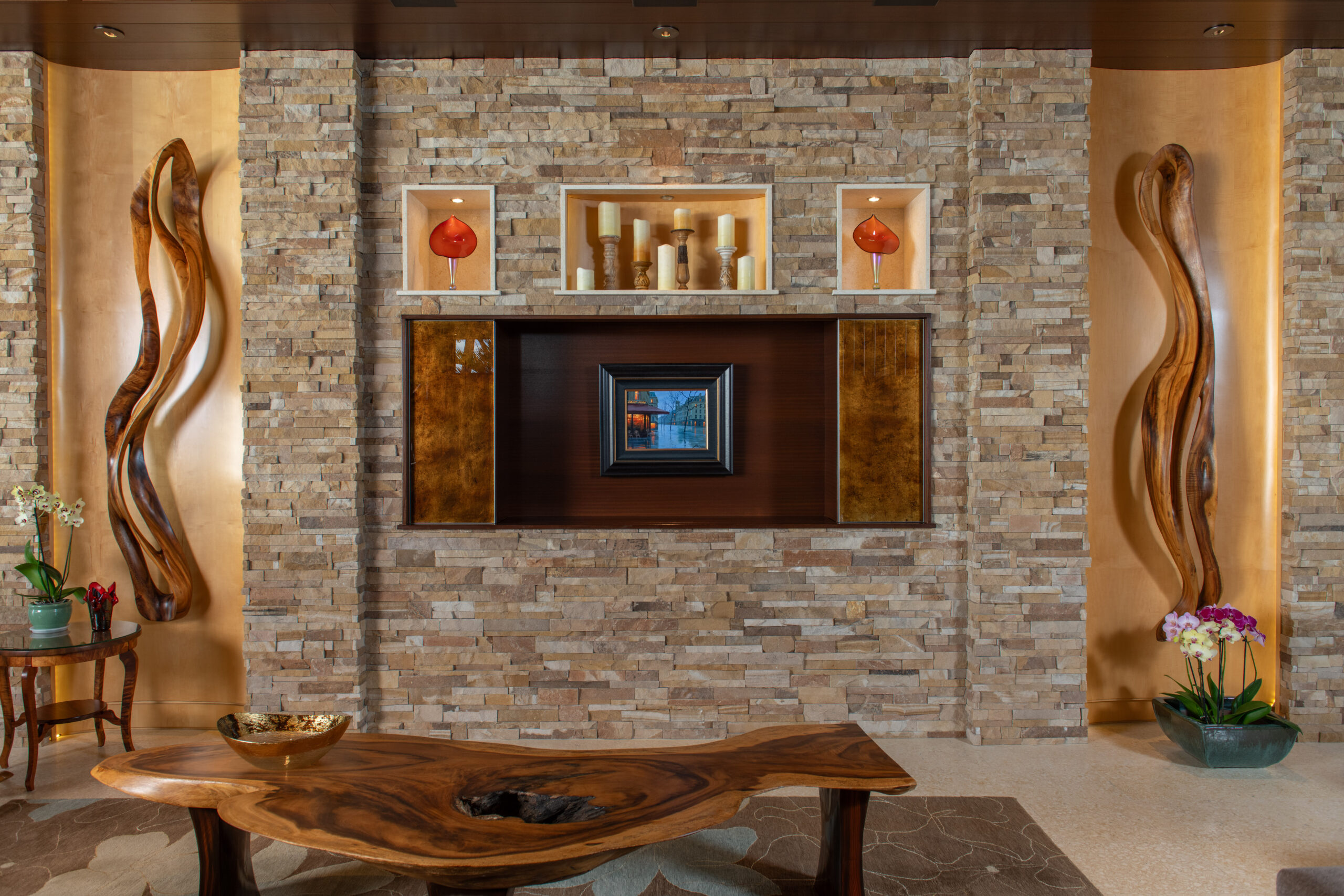 Sculptural Sapele wood ceilings soar from 10’ to 20’ illuminated by modern 3” recessed LED lighting. A breathtaking custom blonde-walnut and stainless-steel floating staircase serves as the home’s contemporary centerpiece. The dramatic 12-foot floating double-glass "wave" kitchen bar - artistically lit for evening ambiance - the floating gold-inlaid automatic book matched cabinetry - the additional butler’s pantry - the in & out upstairs glass showers - stand as some of the home’s most memorable design features.